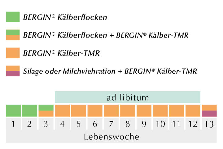 Ab der 3. Lebenswoche BERGIN® Kälber-TMR ad libitum bis ~ 4 Wochen nach dem Abtränken.