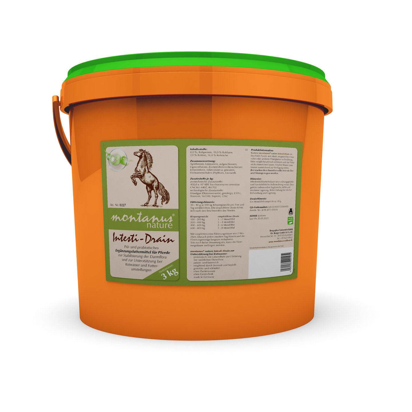 - montanus® nature Intesti-Drain sollte mit 30 - 40 g je 100 kg Körpergewicht mit dem üblichen Futter verabreicht werden.